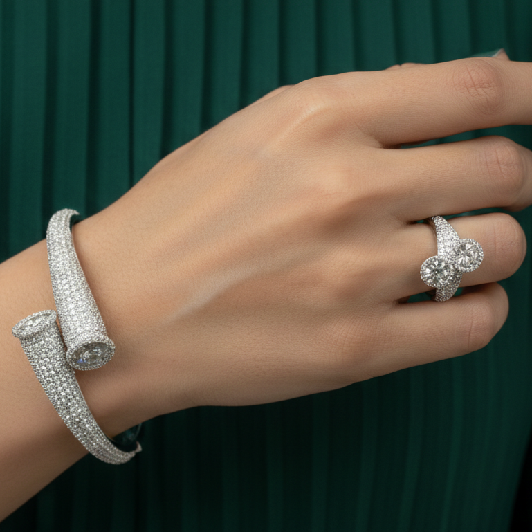 Adorn yourself with this luxurious jewelry set, featuring a stunning bypass bangle and matching ring. Drenched in brilliant pavé-set diamonds, the silver-toned metal provides a sophisticated backdrop for maximum sparkle. Perfect for high-end occasions, this elegant duo offers a timeless, radiant aesthetic for any collection.