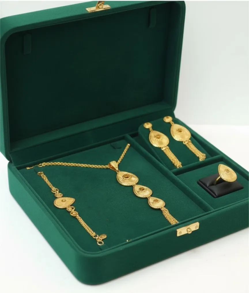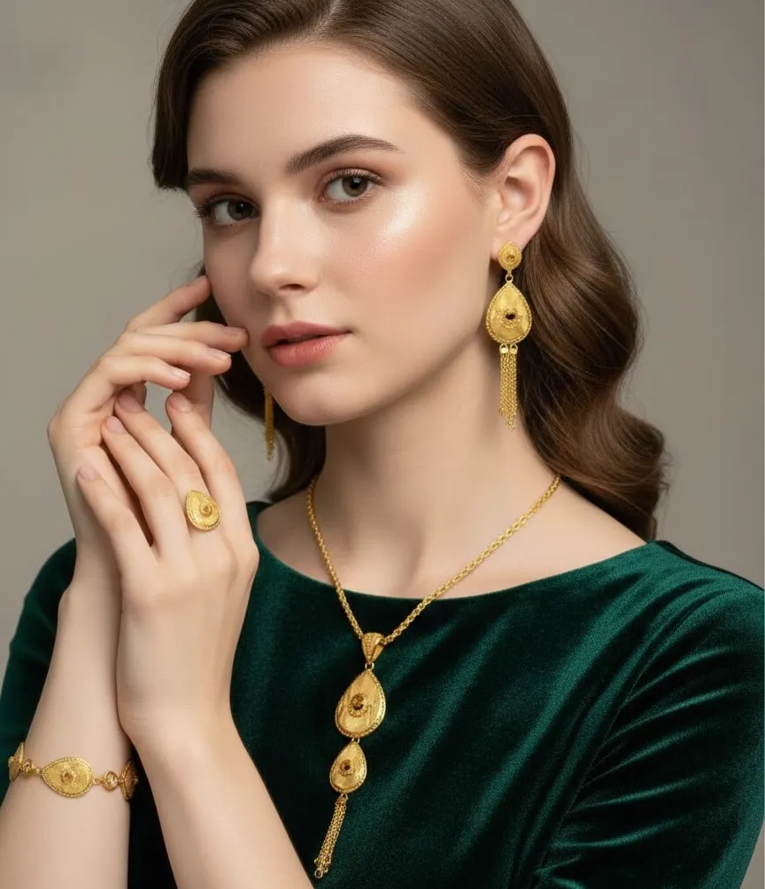 • Plating:Trendy Gold Alloy Plated Jewelry Set for Women – Fashionable Necklace, Bracelet, Earrings and Ring for Party & Engagement