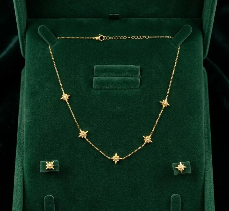 Exquisitely crafted in radiant gold, this celestial jewelry set features a delicate chain necklace adorned with shimmering starburst charms and matching studs, offering timeless elegance for any sophisticated occasion.