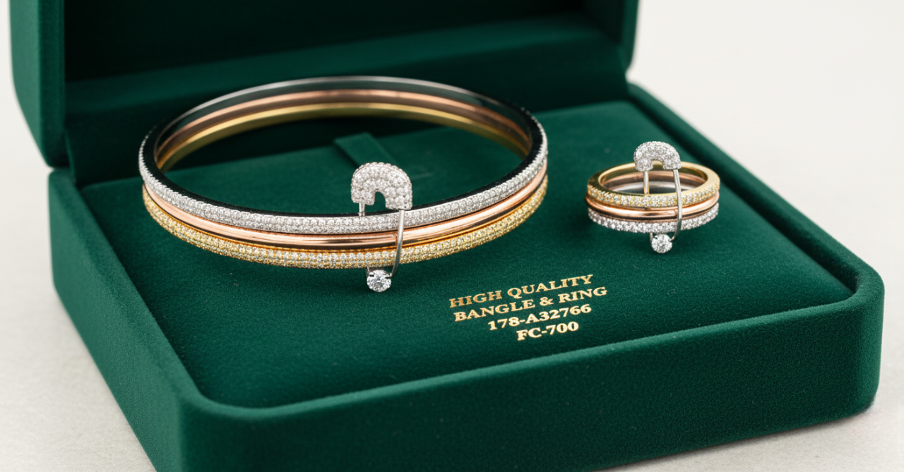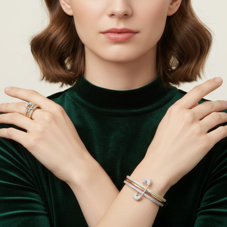 This stunning set features a luxurious bracelet and ring crafted in elegant rose, yellow, and white gold tones. Adorned with shimmering pavé crystals, the unique safety pin motif adds a modern edge to classic sophistication. Perfect for elevating any outfit with timeless, high-quality sparkle.