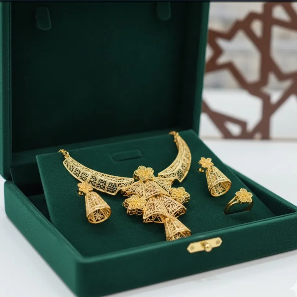 This exquisite handcrafted filigree gold jewelry set, featuring a stunning necklace, matching earrings, and a delicate ring, offers timeless elegance, intricate artistry, and sophisticated luxury for any occasion.