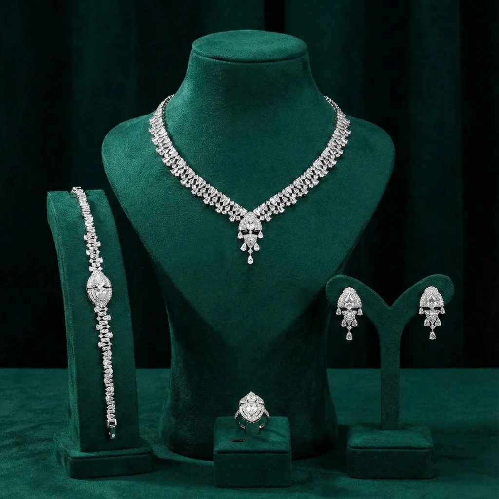 - Statement Full Suite: Includes a stunning V-shaped necklace, matching drop earrings, a refined bracelet, and a bold statement ring.