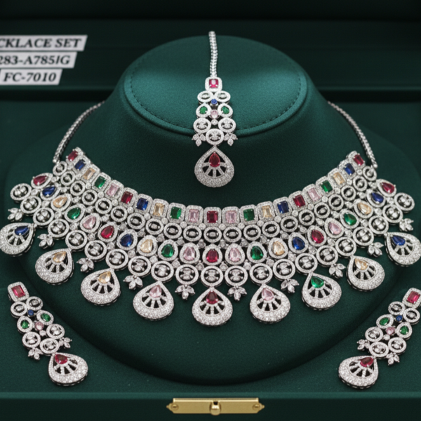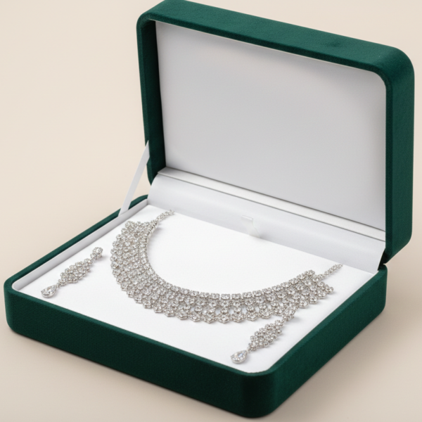 AED530Adorn yourself with this breathtaking jewelry set, featuring a grand, tiered diamond necklace, matching chandelier earrings, a delicate bracelet, and a statement ring. Each piece showcases intricate craftsmanship and brilliant stones, meticulously arranged to capture light and exude timeless luxury for your most special occasions.