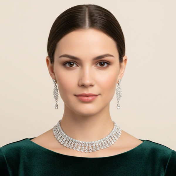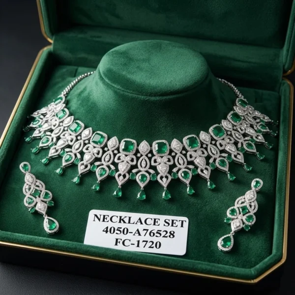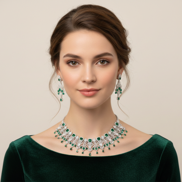 AED250This exquisite necklace set features brilliant green emerald-cut stones surrounded by intricate silver-toned filigree. The matching teardrop earrings complete this luxurious ensemble, offering a sophisticated sparkle for weddings or formal galas. Experience timeless elegance with this high-quality, masterfully crafted jewelry masterpiece.