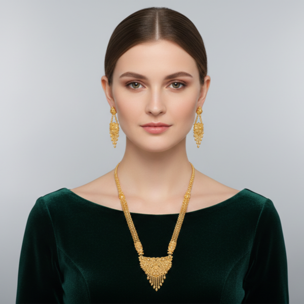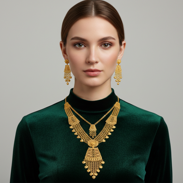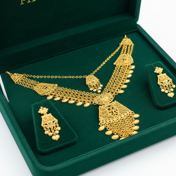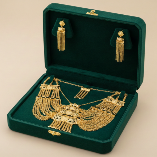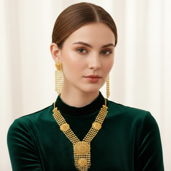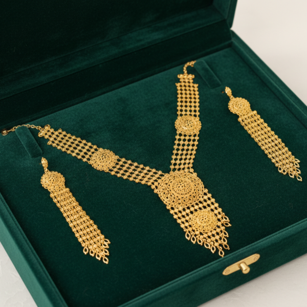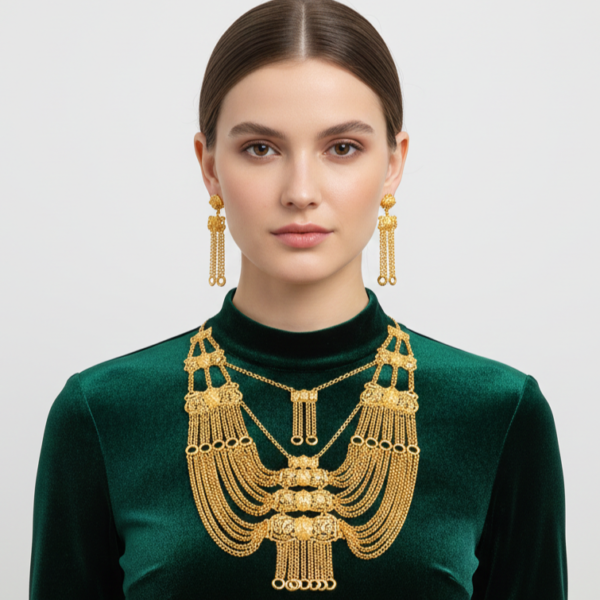 AED225This exquisite jewelry set features a multi-layered gold necklace paired with matching chandelier-style earrings. Crafted with intricate filigree and delicate hanging charms, this piece exudes luxury and traditional elegance. Perfect for special occasions, it offers a timeless, sophisticated look.