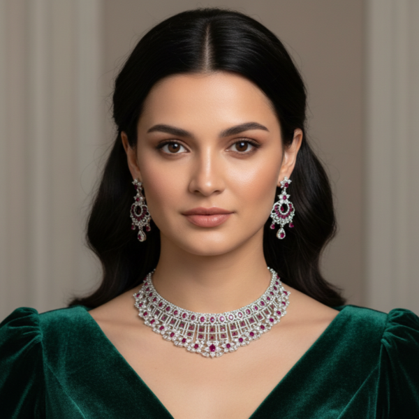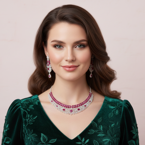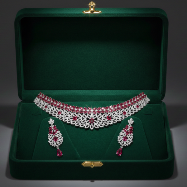 AED299This exquisite necklace set features intricate floral silver-toned metalwork meticulously adorned with shimmering white crystals and vibrant ruby-red stones. The elegant matching drop earrings mirror the necklace’s sophisticated design. Perfect for bridal wear or formal events, this set offers a luxurious, high-end aesthetic.