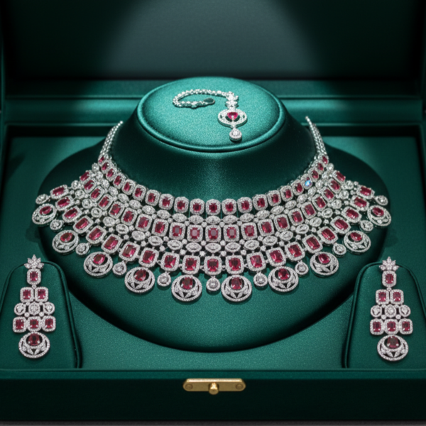AED590Indulge in timeless elegance with this exquisite jewelry collection featuring vibrant, pear-cut rubies framed by shimmering diamonds. The set includes a cascading statement necklace, matching chandelier earrings, a delicate bracelet, and a bold cocktail ring. Perfect for grand occasions, these pieces offer unmatched luxury and sophisticated craftsmanship.