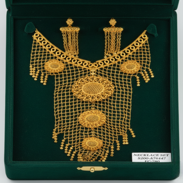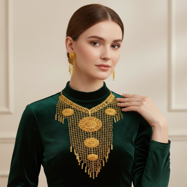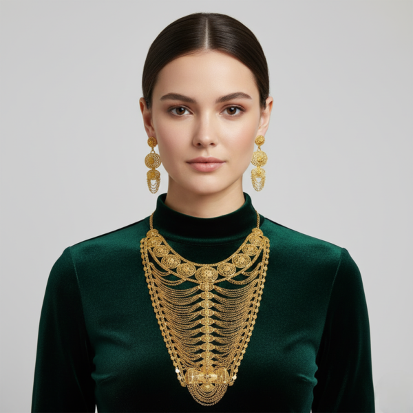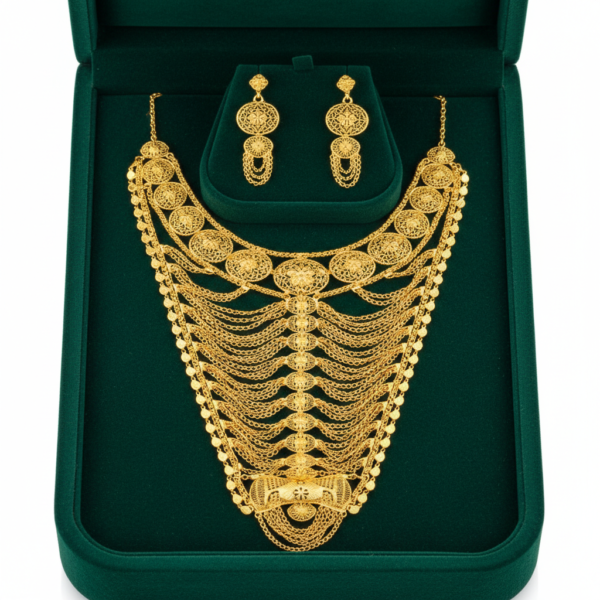 AED280This exquisite gold jewelry set features a stunning, multi-layered bib necklace and matching drop earrings. Intricately crafted with delicate filigree patterns and dangling coin accents, it offers a regal, timeless elegance. Perfect for weddings or special occasions, this high-quality set radiates luxury and sophisticated craftsmanship.
