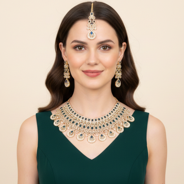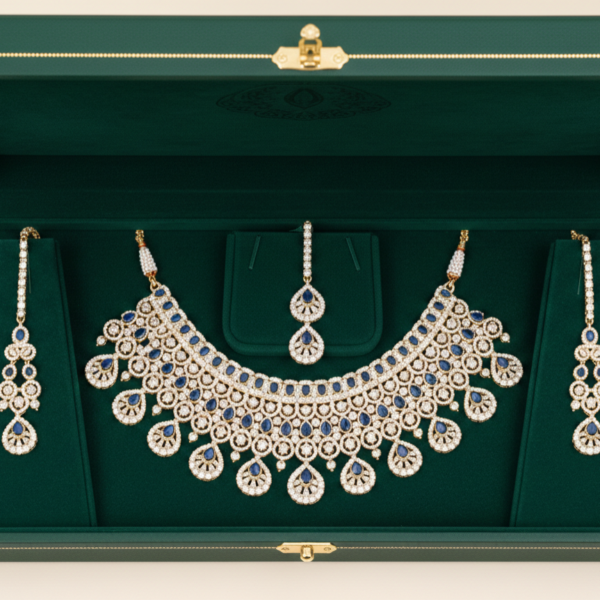AED355Experience timeless royalty with this exquisite jewelry set featuring deep blue sapphire-colored stones. Intricately crafted with gold-toned plating and shimmering white crystals, the ensemble includes a heavy choker necklace, matching drop earrings, and a traditional Maang Tikka to complete your regal aesthetic.