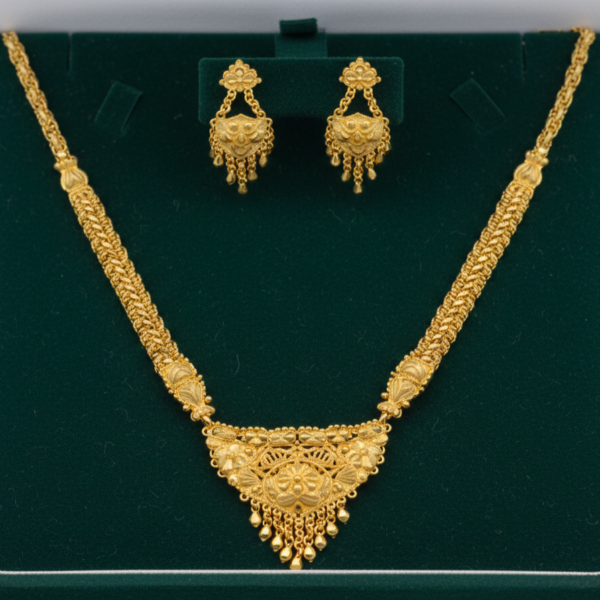 AED175This luxurious jewelry set features a stunningly detailed gold necklace paired with matching ornate earrings. Crafted with intricate filigree patterns and delicate hanging accents, the ensemble radiates timeless elegance. Perfect for special occasions, its high-quality finish ensures a sophisticated, radiant glow that elevates any formal attire.