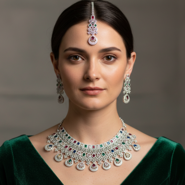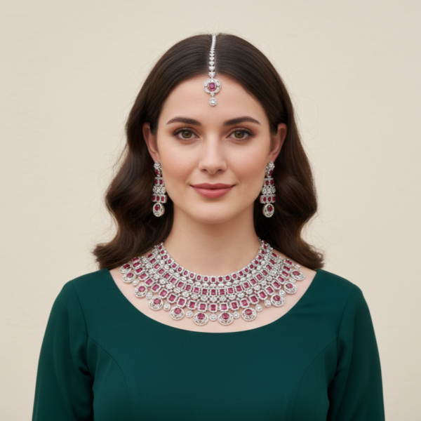 AED355Exalt your bridal look with this stunning ruby-red and silver-toned necklace set. Featuring a multi-layered choker design, it is intricately embellished with vibrant stones and shimmering crystals. The set includes matching drop earrings and a delicate maang tikka, perfect for weddings and festive celebrations.
