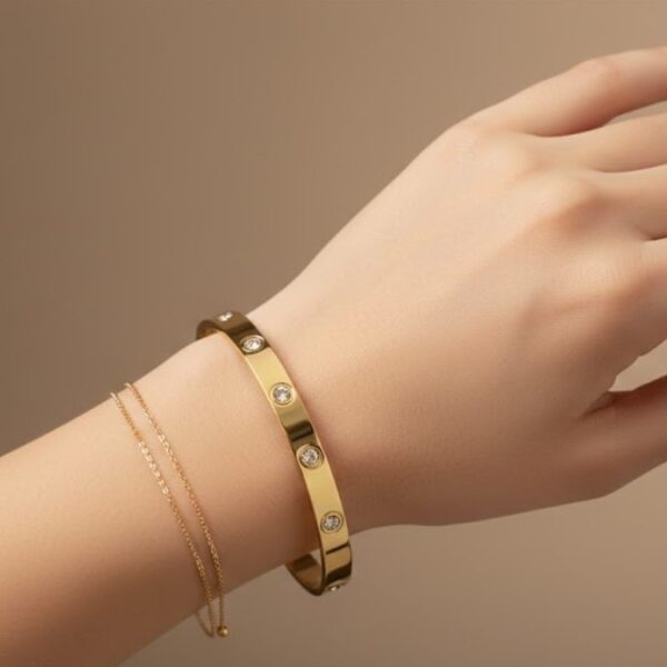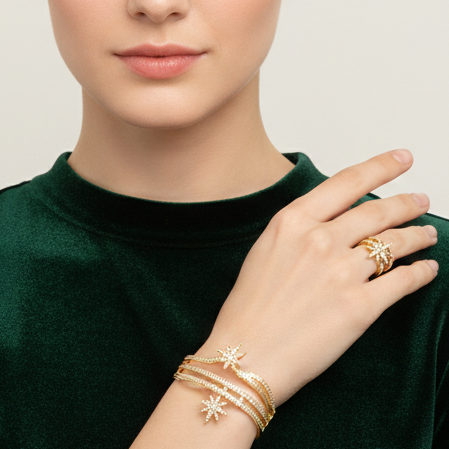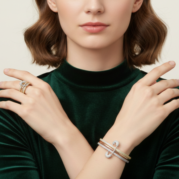 AED110This stunning set features a luxurious bracelet and ring crafted in elegant rose, yellow, and white gold tones. Adorned with shimmering pavé crystals, the unique safety pin motif adds a modern edge to classic sophistication. Perfect for elevating any outfit with timeless, high-quality sparkle.