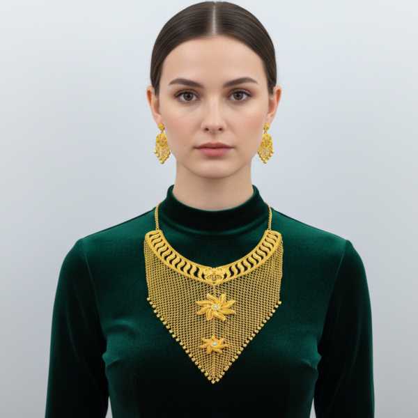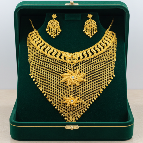 AED250Indulge in the unmatched elegance of this luxurious gold jewelry set, featuring a breathtaking, intricate filigree mesh necklace adorned with radiant floral motifs. Accompanied by matching ornate drop earrings, this high-quality collection offers a timeless, sophisticated design, perfect for elevating any formal ensemble with majestic brilliance.