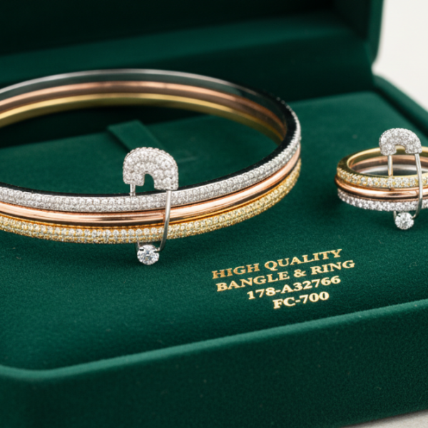 AED70This stunning set features a luxurious bracelet and ring crafted in elegant rose, yellow, and white gold tones. Adorned with shimmering pavé crystals, the unique safety pin motif adds a modern edge to classic sophistication. Perfect for elevating any outfit with timeless, high-quality sparkle.